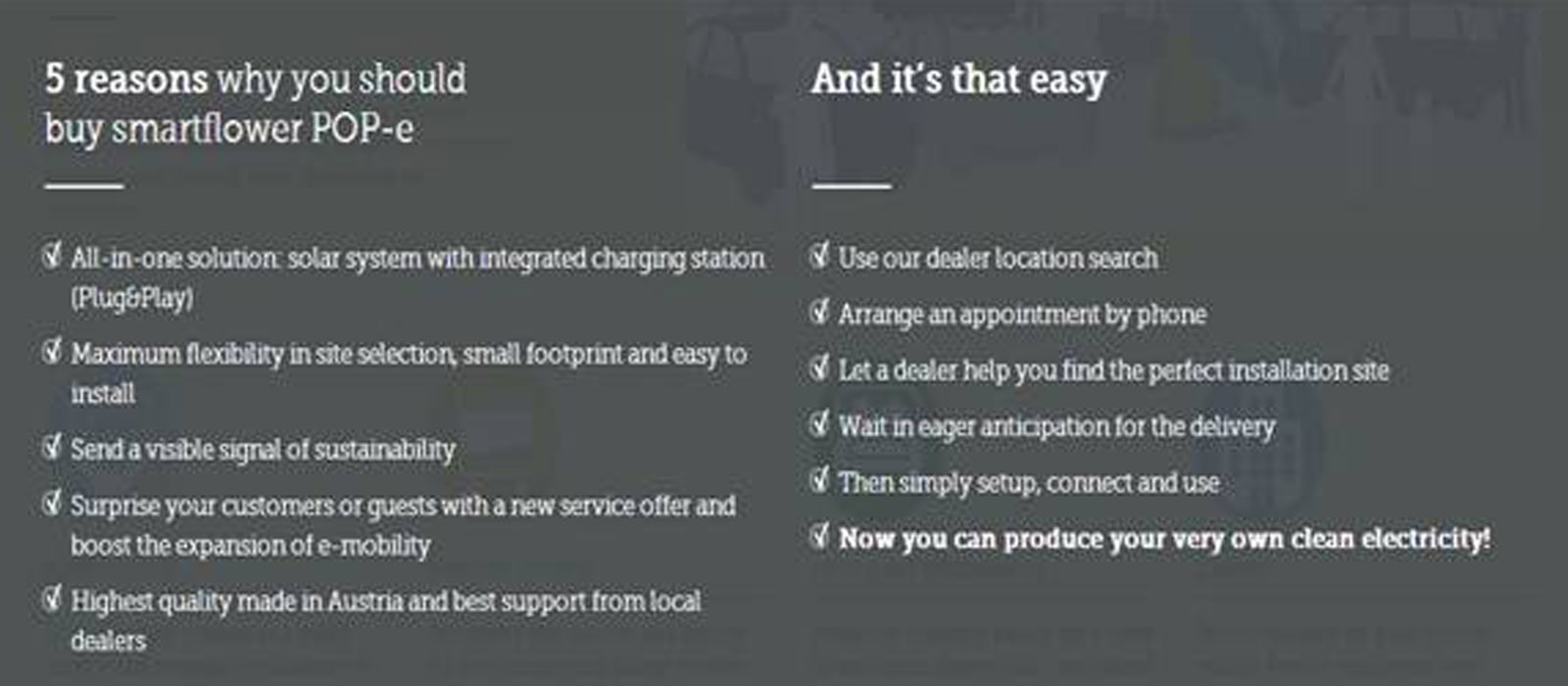 Manufacturing takes place in Austria using high quality materials so that our products produce electricity as long as possible. 25 years – we guarantee this is with our module performance guarantee.Thanks to its extraordinary construction and the perfectly synchronized components, the system delivers, on an average, approx. 6,200 kWh per year. Smartflower represents changing times. The size of the system alone is no longer the measure of all things. What counts is a fairly constant production rate during the course of the day in order to enable a more effective use of the produced energy. Smartflower achieves self-utilization of around 60% – a significant improvement over a comparable rooftop unit, which averages just around 20%. Now that is what we call smart!