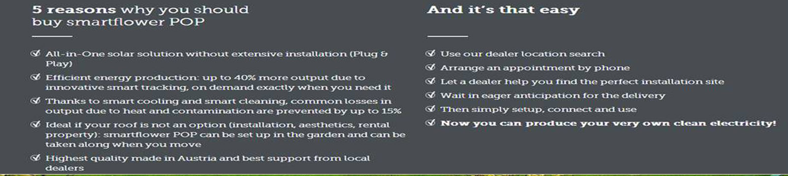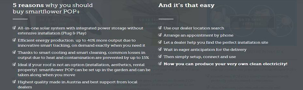 Smart Flower – Wouldn’t it be wonderful if each of us could produce all clean energy we need right in our backyards? And wouldn’t it be cherry on top if the same photovoltaic system could simply be plug-&-play like any other normal home appliance? At smartflower, we have stopped asking such questions. Instead, we have answered them – with smartflower, the world’s first all-in-one solar system.